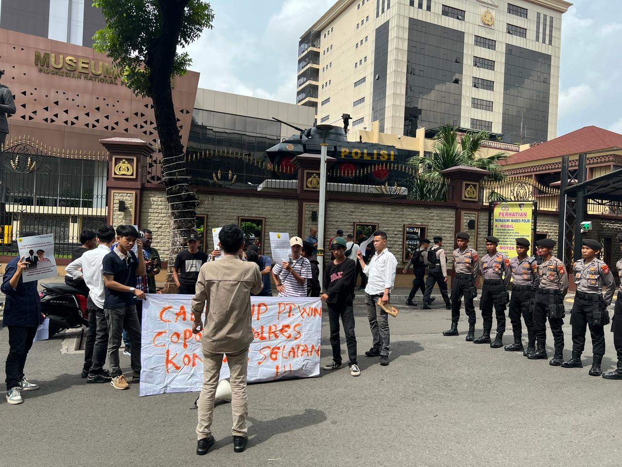 Portalterkini.com, Jakarta – Ikatan Pemuda Pelajar Mahasiswa Konawe Selatan (IPPMI Konsel – Jakarta) telah resmi menggelar aksi unjuk rasa untuk yang ketiga kalinya didepan gedung utama Markas Besar Kepolisian Republik Indonesia (Mabes Polri) dan juga di halaman gedung utama Direktorat Jenderal Mineral dan Batu Bara. Senin,(29/01/24).