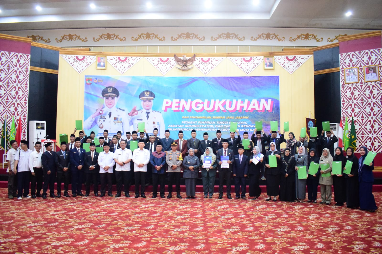 Dalam hal ini Wakil Bupati Musi Rawas Hj. Suwarti didampingi oleh Forkopimda dan Sekda H. Aidil Rusman, Wabup mengucapkan selamat kepada para pejabat yang baru saja dilantik dan diambil sumpahnya dalam jabatan pimpinan tinggi pratama, jabatan administrator, pejabat pengawas dilingkungan Pemerintah Kabupaten Musi Rawas.