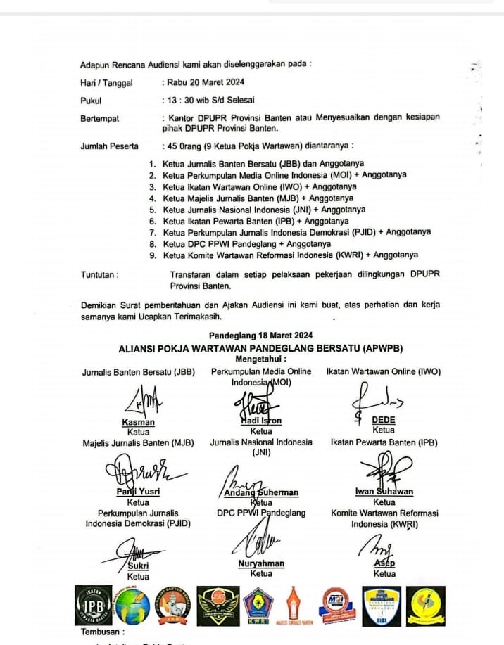 “Surat audiensi ini sudah berdasarkan kesepakatan bersama para ketua organisasi pers yang ada di Pandeglang. Tentunya organisasi yang tergabung dalam APWPB,” Kata Kasman.