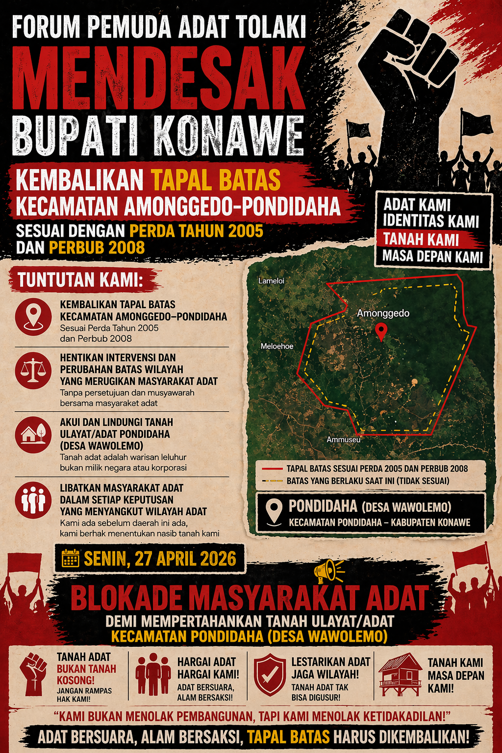 Aksi ini akibat lambannya Pemda Konawe menyelesaikan persoalan sengketa Tapal Batas di kecamatan Pondidaha dan Amonggedo. Sengketa Tapal Batas kedua kecamatan ini telah berlangsung 17 Tahun Lamanya, hingga saat ini.