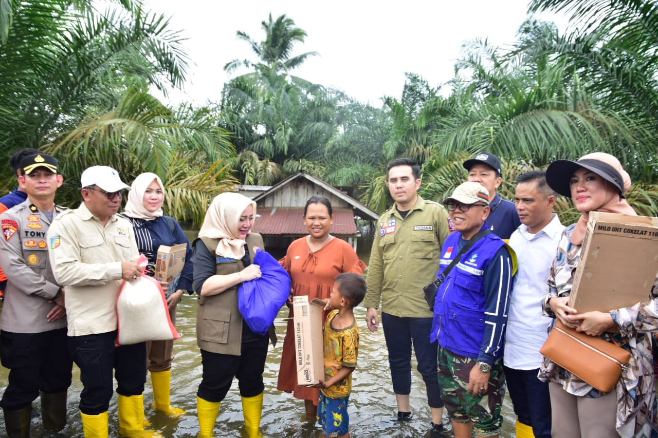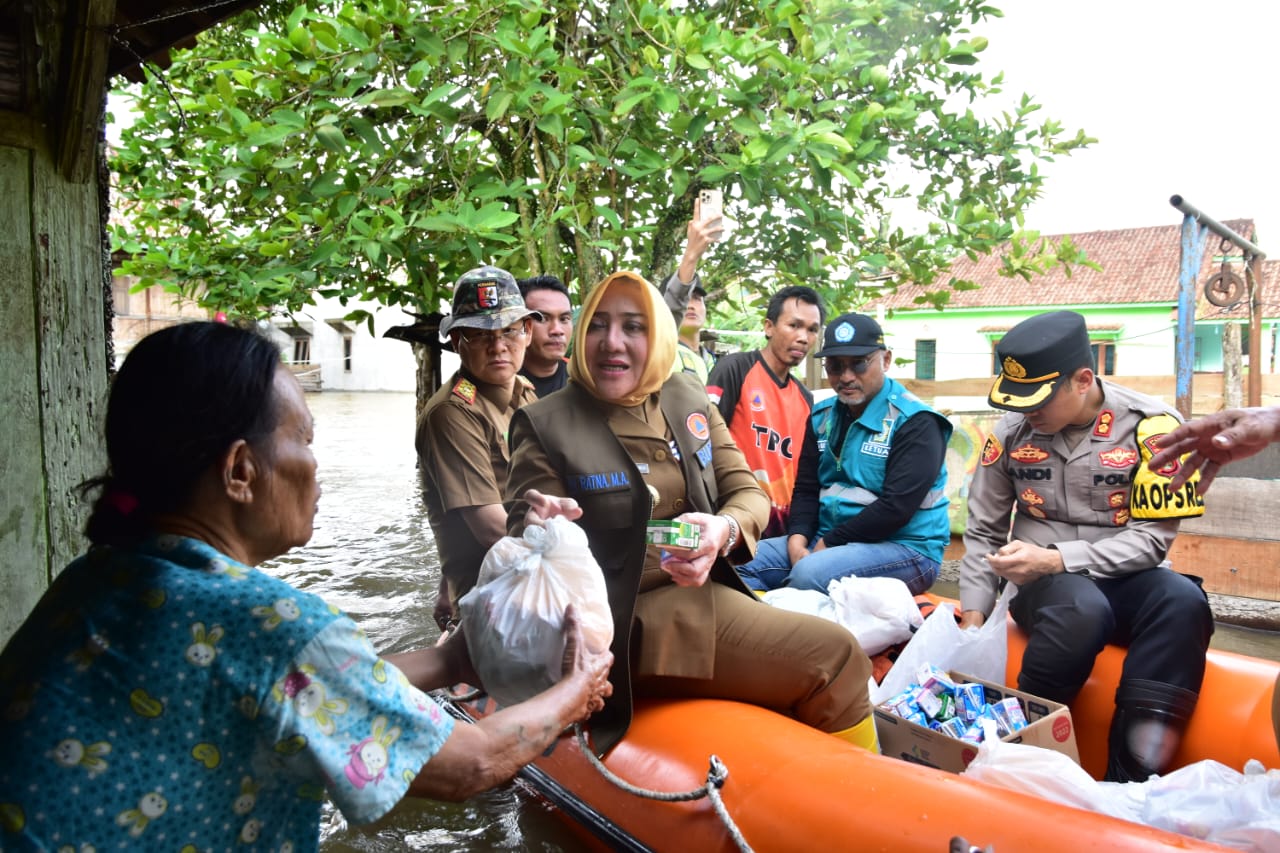 Bupati Musi Rawas Hj. Ratna Machmud bersama Ketua TP PKK Musi Rawas H Riza Novianto Guatam meninjau dan memberikan bantuan yang beberapa dibagikan secara door to door bagi warga yang terdapat bencana banjir di Kelurahan Muara Lakitan, Kecamatan Muara Lakitan, Senin (15/01/2024).