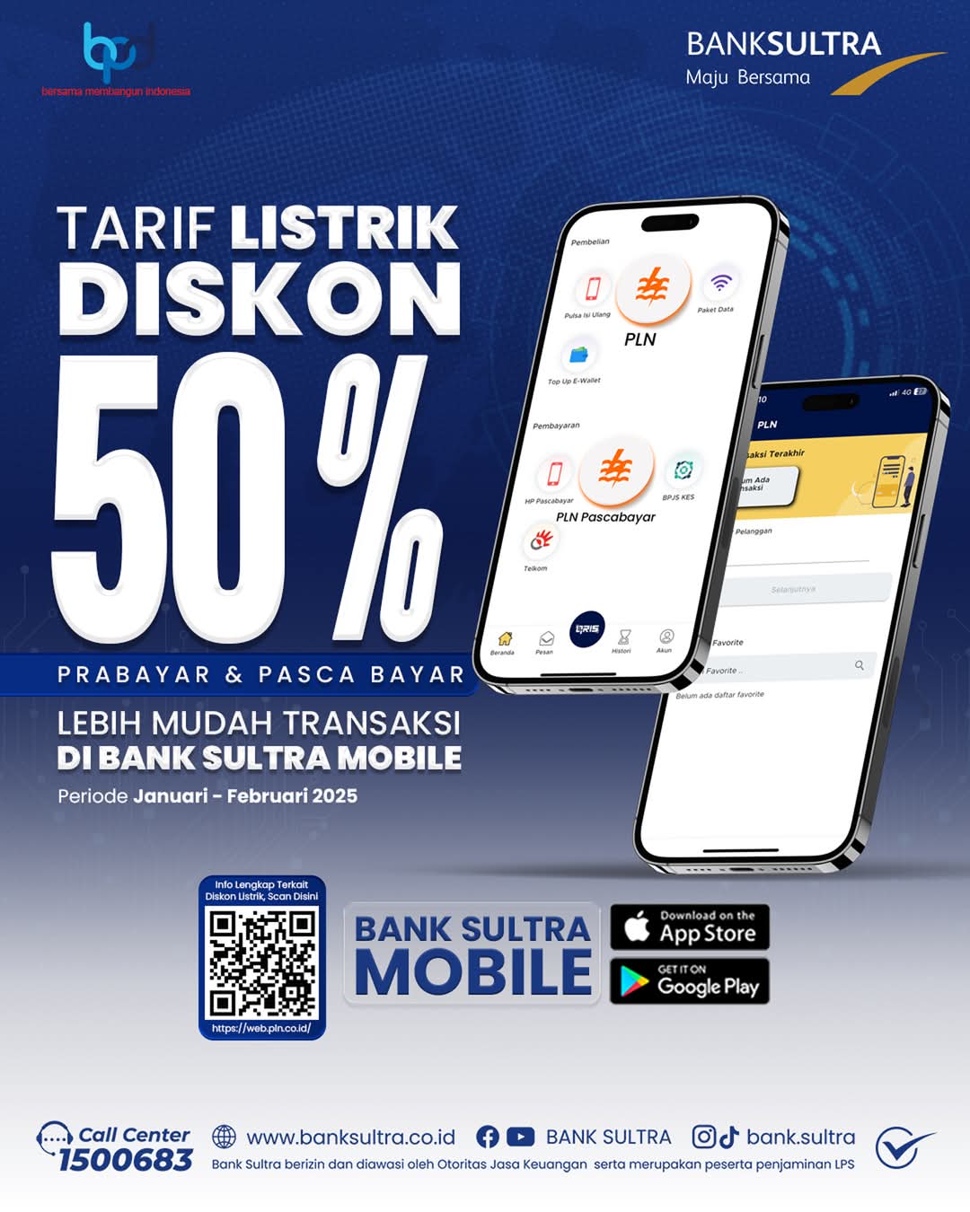 * Pelanggan Prabayar; cukup membeli setengah (50%) dari biasanya untuk mendapatkan energi (kWh) yang sama di manapun berlaku. Diskon ini juga langsung berlaku pada pembelian Token Listrik selama Periode Januari sampai dengan Februari Tahun 2025.