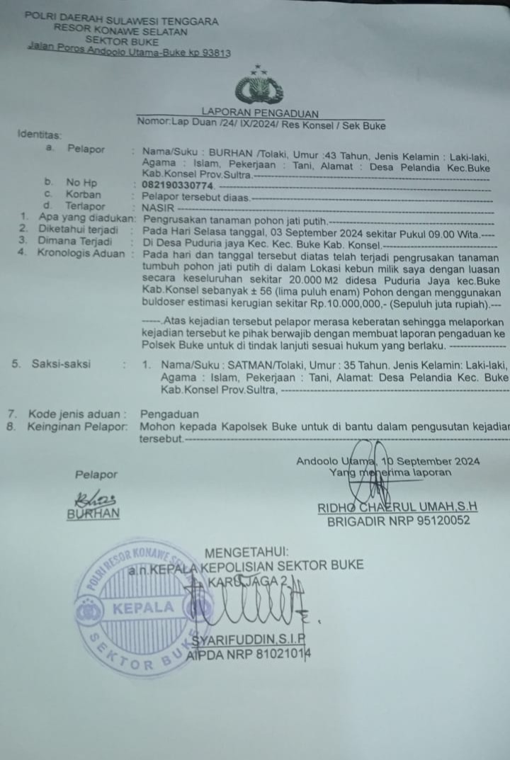 Portalterkini.com – Konawe Selatan, Warga Desa Pelandia melaporan resmi oknum karyawan PT. Kilau Indah Cemerlang ( KIC) di Polsek Buke Kabupaten Konawe Selatan. Selasa, 10/09/2024.