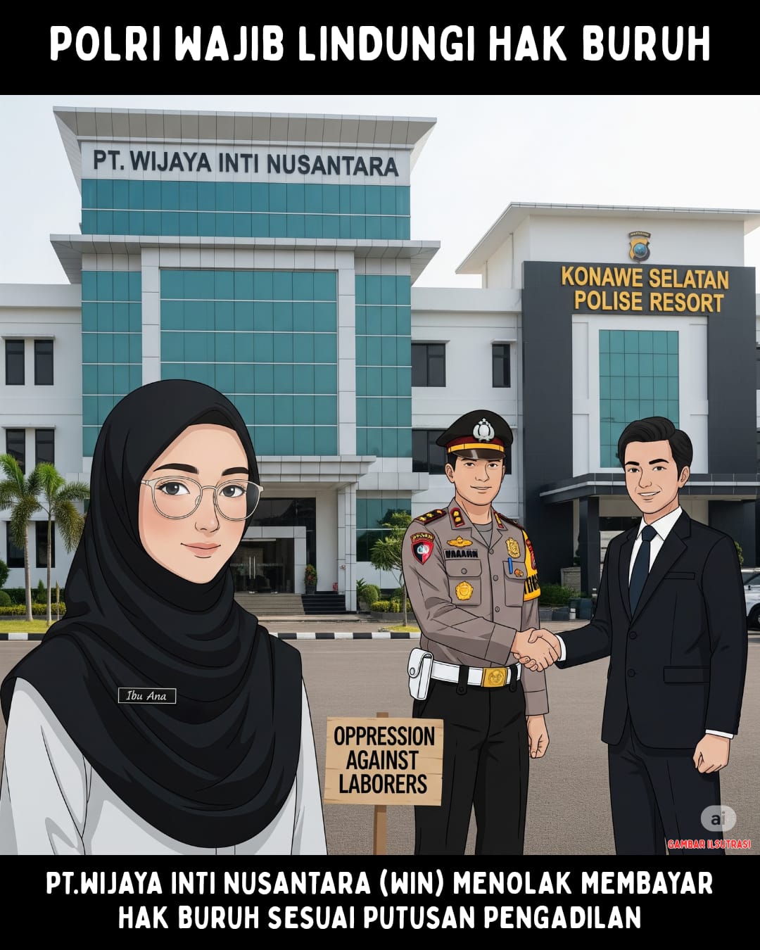 Salah satu buruh di Konawe Selatan, Agus Mariana (Ibu Ana) mendapatkan penindasan atas hak-haknya yang tidak dibayarkan oleh PT. Wijaya Inti Nusantara (WIN) meski ia telah melalui Putusan Pengadilan Mahkamah Agung Republik Indonesia.