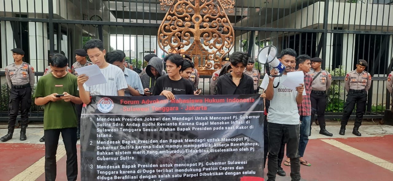 Portalterkini.com – Jakarta – Forum Advokasi Mahasiswa Hukum Indonesia Sulawesi Tenggara Melakukan Aksi Unjuk Rasa di depan Kementerian Dalam Negeri dan meminta Presiden untuk Mencopot Pj Gubernur Sultra. 10/01/2024