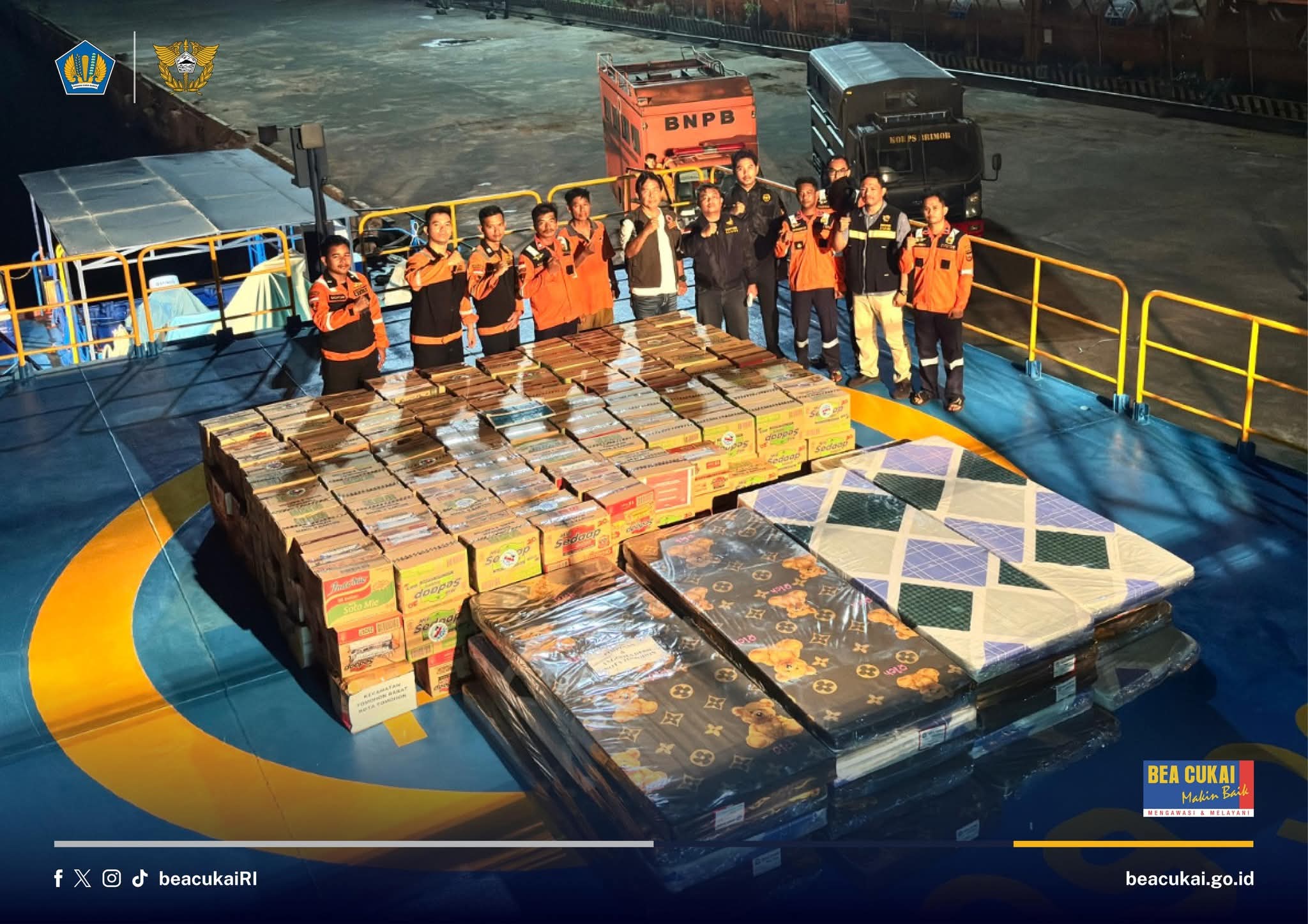 Untuk memperlancar proses mobilisasi dan pendistribusian bantuan, Bea Cukai menurunkan Kapal Patroli BC60002 yang diberangkatkan dari Pelabuhan Bitung menuju lokasi bencana. Pemanfaatan sarana laut ini diharapkan dapat memastikan bantuan tiba tepat waktu, mengingat kondisi geografis Kepulauan Sitaro yang sebagian besar hanya dapat diakses melalui jalur perairan.