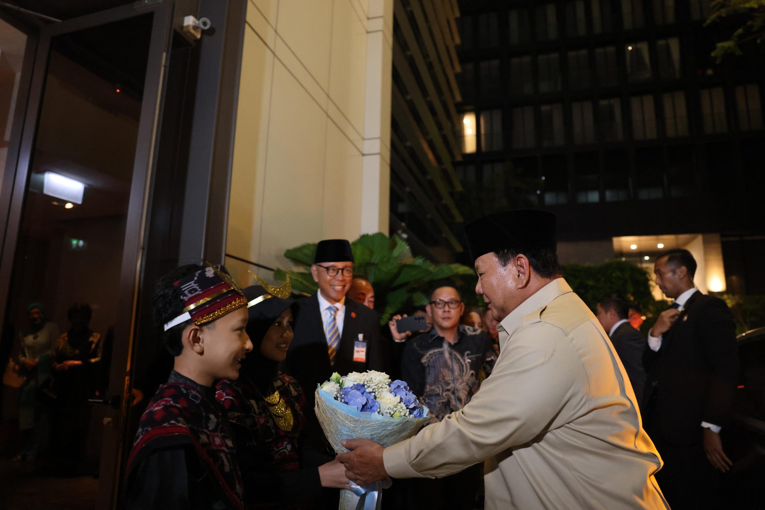 Dua putra-putri Indonesia berpakaian adat Nusa Tenggara Timur (NTT) menyerahkan karangan bunga kepada Presiden Prabowo sebagai bentuk penghormatan dan kebanggaan. Di sepanjang pintu masuk hotel, masyarakat Indonesia yang berdomisili di Thailand, mulai dari pelajar, pekerja, hingga pelaku usaha, turut menyambut dengan antusias.