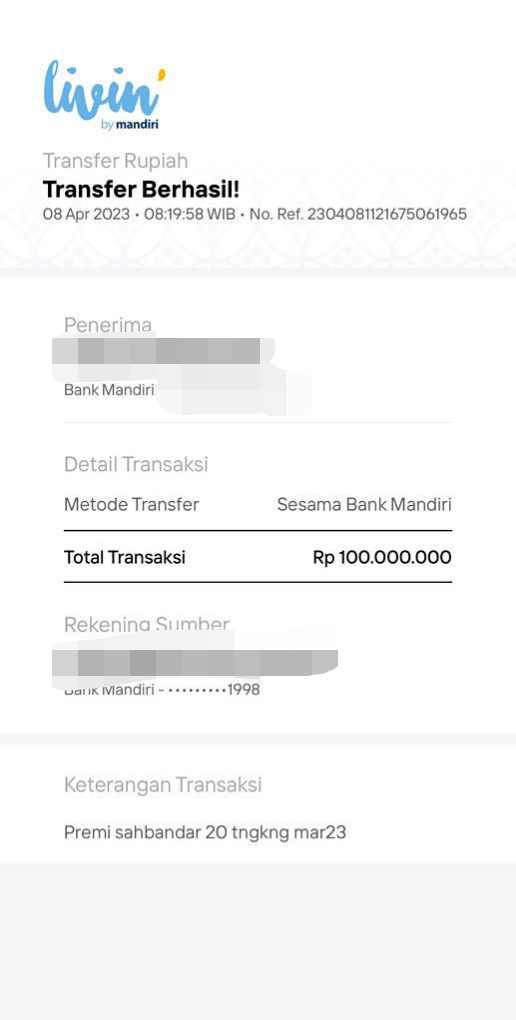 Dalam keterangan bukti transaksi tersebut bertuliskan “premi syahbandar 20 tongkang Bulan Maret” dengan nilai 100 juta yang dikirm pada tanggal 08 April 2023 lalu.