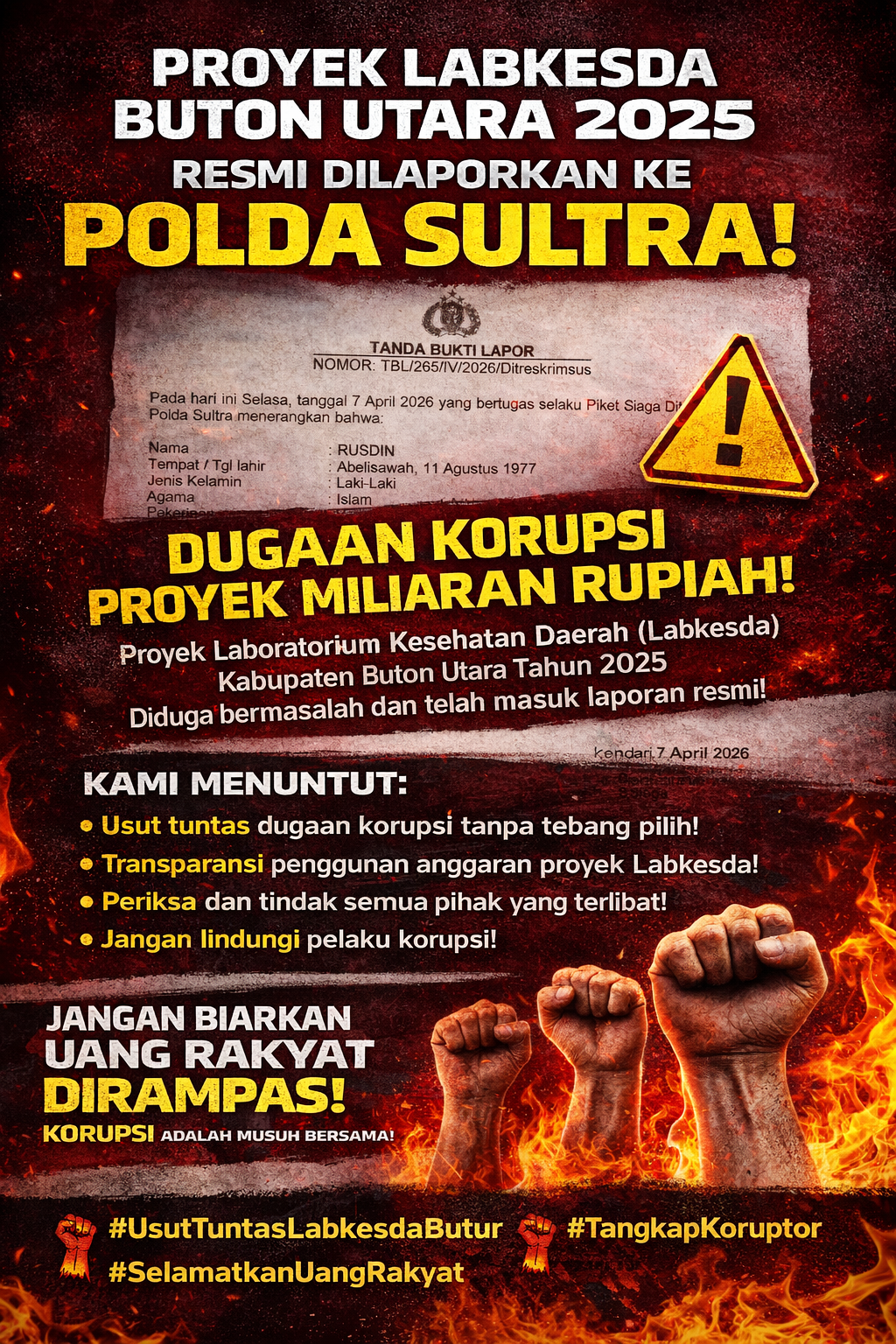 Laporan pengaduan tersebut teregistrasi dengan nomor TBL/265/IV/2026/Ditreskrimsus. Adapun objek yang dilaporkan adalah proyek pembangunan gedung Laboratorium Kesehatan Daerah (Labkesda) Buton Utara tahun anggaran 2025.