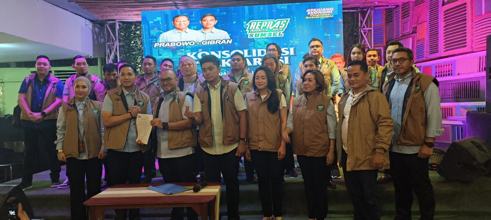 PortalTerkini.com,- Konsolidasi dan Deklarasi yang di laksanakan oleh Pendukung Prabowo – Gibran Relawan Pengusaha Muda Nasional (Repnas) Sumsel Indonesia maju Sumsel yang di gelar di gins cafe jalan kambang iwak, Sabtu malam (13/1/2024)
