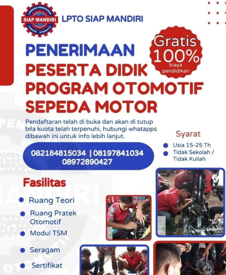 LPTO SIAP MANDIRI akan menyelenggarakan program PKK dari Kementerian Pendidikan RI dengan membuka Pendaftaran Peserta Didik untuk Program MONTIR BENGKEL SEPEDA MOTOR LEVEL 3 yang 100 persen GRATIS (syarat berlaku) dan dilengkapi, dengan kesempatan untuk penyaluran tenaga kerja ke mitra DUDI kami.