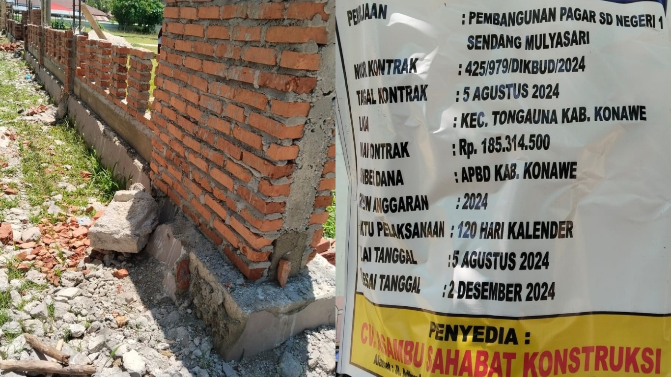 Untuk diketahui, Proyek Pembangunan Pagar SDN I Sendang Mulyasari dikerjakan CV. dikerjakan oleh CV. Asambu Sahabat Konstruksi dengan kontrak Nomor : 425/979/DIKBUD/2024, yang dimulai pada Tanggal 5 Agustus sampai dengan Tanggal 2 Desember 2024, dengan anggaran sebesar Rp. 185.314.500, Tahun anggaran 2024 yang bersumber dari Dinas Pendidikan dan Kebudayaan Kabupaten Konawe.