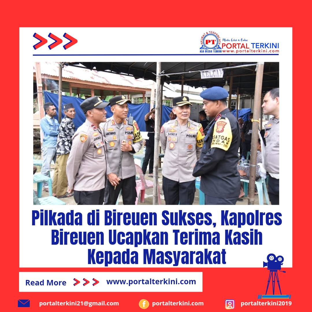 ” Alhamdulillah Pilkada Dikabupaten Bireuen berjalan aman, damai dan sukses, saya mengucapkan terima kasih kepada seluruh Elemen Masyarakat Kabupaten Bireuen yang telah bersatu untuk menjaga situasi kamtibmas kondusif, pada hari pencoblosan dan penghitungan Surat Suara di 823 TPS berjalan sukses tanpa ada kendala, ini merupakan wujudnyata Persatuan Masyarakat untuk Bireuen Aman dan Maju, sekali lagi apresiasi dan penghormatan saya kepada seluruh Masyarakat Kabupaten Bireuen” Ucap AKBP Jatmiko