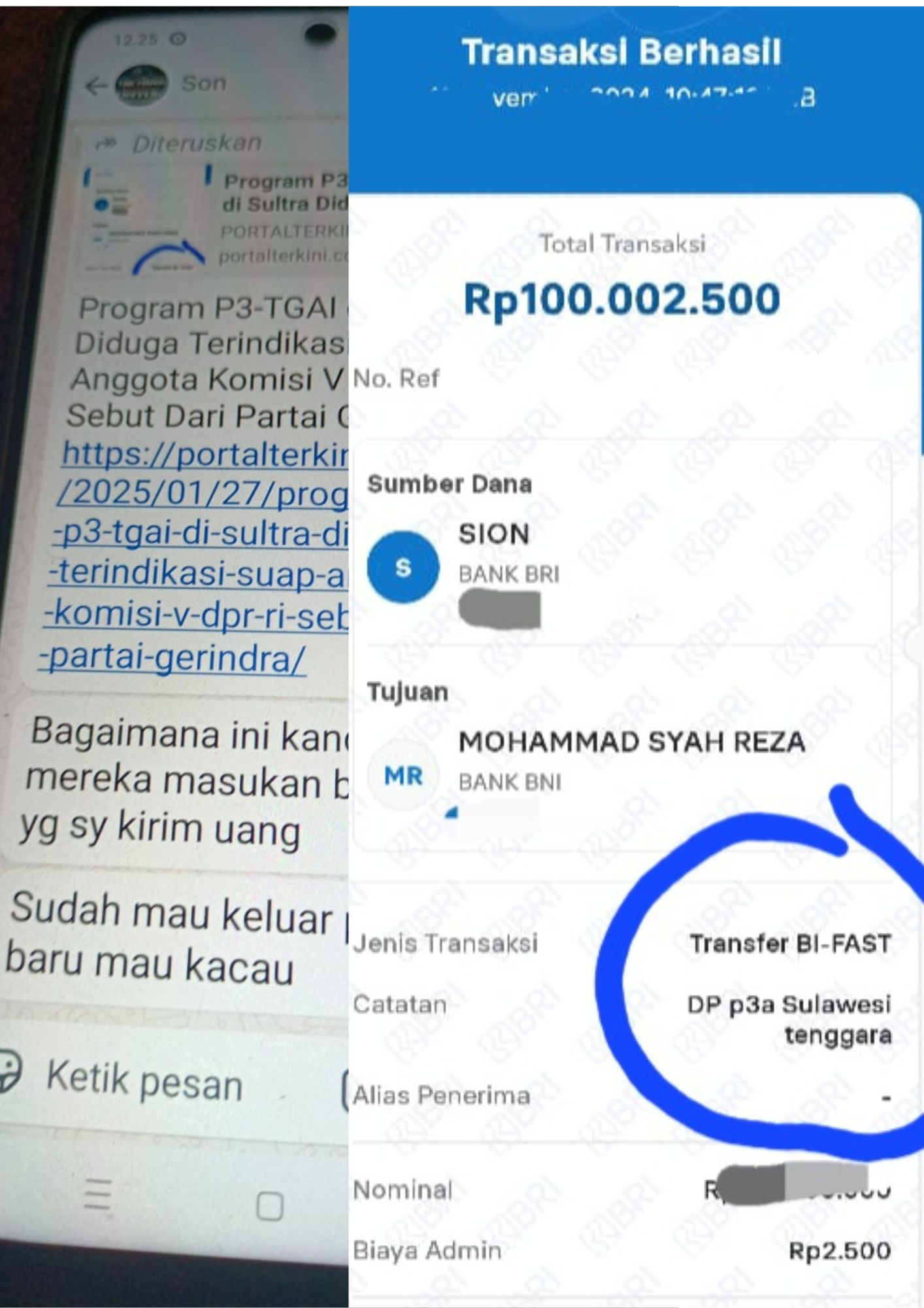 Bukti transfer dana 100 Juta Rupiah itu bertuliskan “DP (Uang Muka) P3A Sulawesi Tenggara”, yang dikirim pada Tanggal 11 November 2024, Jam 10:47:13 WIB.
