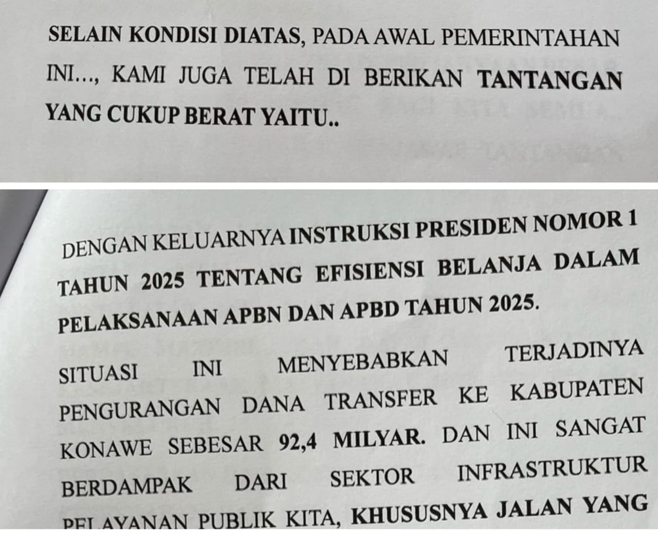 “Situasi ini menyebabkan terjadinya pengurangan dana transfer ke Kabupaten Konawe sebesar 92,4 miliar, dan ini sangat berdampak dari sektor infrastruktur pelayanan publik kita,” jelasnya.